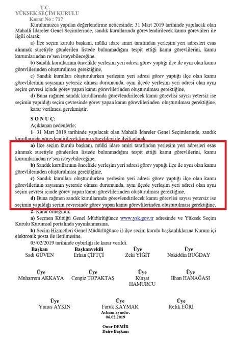 “Kamuoyu, Ak Parti'nin mesnetsiz itirazları nedeniyle İstanbul Büyük Şehir Başkanlığı seçiminin YSK tarafından yenilenip yenilenmeyeceğini tartışıyor. Biz CHP olarak seçimin yenilenmesinin hukuken mümkün olmadığını biliyoruz. Bunun dayanakları bizzat YSK’nın kendi kararlarında mevcut. İlk Karar 2018 Seçimlerinin Öncesinde, Samsun Atakum İlçe Seçim Kurulu'nun görüş sorması üzerine YSK tarafından 10.05.2018'de verilmiştir. Karar ‘Sandık Kurullarının öncelikle yerleşim yeri adresi görev yaptığı ilçe ile aynı olan kamu görevlilerinden oluşturulması gerektiğine sandık kurulları oluşturulurken yerleşim yeri adresi görev yaptığı ilçe olan kamu görevlilerinin sayısının yetersiz olması durumunda, aynı ilçede yerleşim yeri adresi olan aynı seçim çevresi içinde görev yapan kamu görevlilerinden oluşturulması gerektiğine, hükmetmiştir. Bu karar tam da Ak Parti'nin seçimin yenilenmesi için öne sürdüğü ‘İlçe Dışından Sandık Görevlileri Belirlendiği’ itirazının dayanaksız olduğunu, sandık görevlilerinin ilçe dışından da belirlenebileceğinin ispatıdır" dedi.