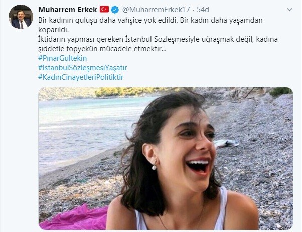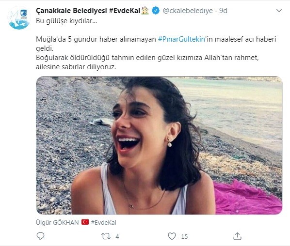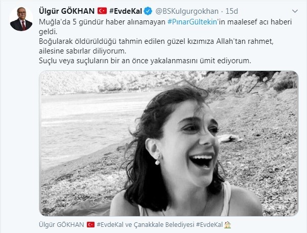 Pınar Gültekin’ in vahşice öldürülmesinin ortaya çıkmasının ardından sosyal medyada en çok konuşulan konu oldu. Türkiye’ nin ve Çanakkale’nin önde gelen isimleri vahşi cinayet ile ilgili düşüncülerini sosyal medyadan paylaşarak” Kadın Cinayetlerinin “Önüne Geçilmesi Gereken Sorumluluk ve Yasal Düzenlemelerin Yapılmasına” vurgu yapıldı. İşte Pınar Gültekin cinayetinin ardından Twitter paylaşımlarından örnekler.