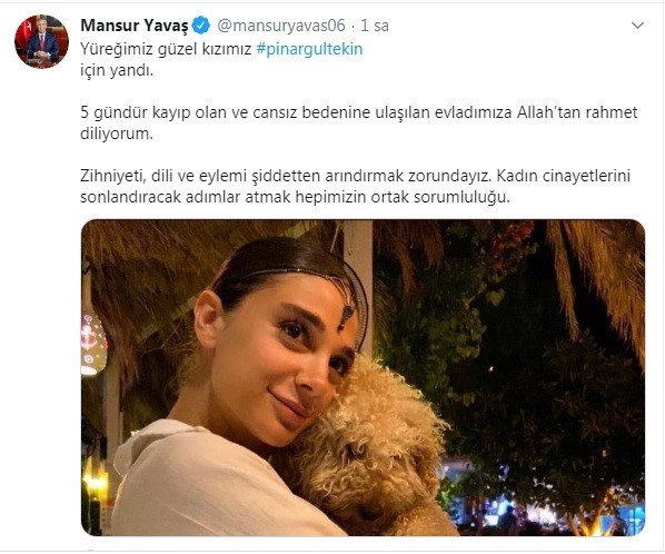 Yüreğimiz güzel kızımız #pinargultekin için yandı. 5 gündür kayıp olan ve cansız bedenine ulaşılan evladımıza Allah’tan rahmet diliyorum. Zihniyeti, dili ve eylemi şiddetten arındırmak zorundayız. Kadın cinayetlerini sonlandıracak adımlar atmak hepimizin ortak sorumluluğu.