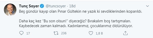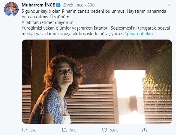 5 gündür kayıp olan Pınar’ın cansız bedeni bulunmuş. Hayatının baharında bir can gitmiş. Üzgünüm. Allah’tan rahmet diliyorum. Yüreğimizi yakan ölümler yaşanırken İstanbul Sözleşmesi’ni tartışarak, sosyal medya yasaklarını konuşarak boş işlerle uğraşıyoruz. #pinargultekin